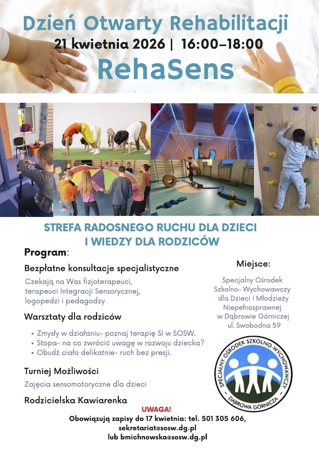 Już 21 kwietnia w godzinach od 16.00 do 18.00 w naszym Ośrodku odbędzie się DZIEŃ OTWARTY REHABILITACJI. Zapraszamy rodziców, opiekunów i wszystkich, którzy szukają wsparcia dla swoich pociech. Przyjdź, porozmawiaj z nami, skorzystaj z bezpłatnych konsultacji specjalistycznych i warsztatów. Zobacz nasze sale i poczuj energię miejsca, w którym wiara w możliwości nigdy się nie kończy. Dzieci zapraszamy do udziału w zajęciach sensomotorycznych podczas Turnieju Możliwości. Klikajcie w wideo na FB SOSW, a zobaczycie naszą codzienność- momenty skupienia, cierpliwości, radości i dumy w oczach naszych podopiecznych. Wierzymy, że każde dziecko ma swój własny rytm, a my pomagamy mu go odkryć i rozwinąć. Informujemy, że na wydarzenie obowiązują zapisy do 17 kwietnia (szczegóły widoczne na plakacie).