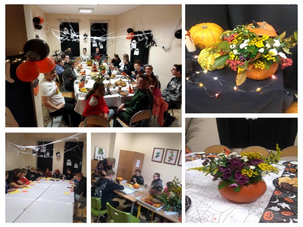 Dnia 28 października uczniowie branżowej szkoły – hotelarze i ogrodnicy gościli uczniów ze Specjalnego Ośrodka Szkolno-Wychowawczego w Chrzanowie. Celem spotkania było poprowadzenie jesiennych warsztatów florystycznych. Zamysłem zajęć było wykorzystanie dyni, nie tylko w postaci wydrążonych lampionów, lecz także jako dekoracji stołowej w formie wazonów, w których umieszczono wrzosy, barwne liście, gałęzie drzew, kwiaty wrotyczu i nawłoci. Zaskoczeniem dla uczestników warsztatów było wykorzystanie drobnych kwiatów chryzantemy, jako dopełnienie kompozycji. Ponadto uczniowie zapoznali się z okolicznościową dekoracją sali, składali serwetki w kształcie liści oraz nakrywali do stołu – wszystko to w jesiennej odsłonie. Była to doskonała okazja do wspólnego spędzenia czasu, integracji młodzieży oraz nawiązania nowych znajomości przy stole, na którym nie brakowało smakołyków przygotowanych przez cukierników.