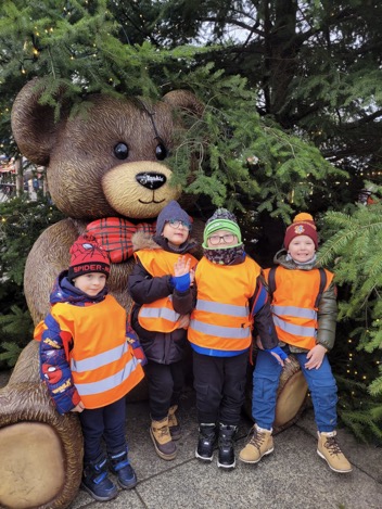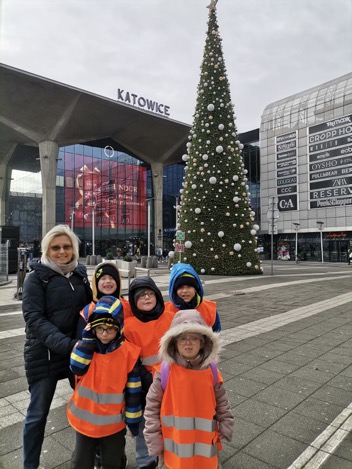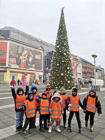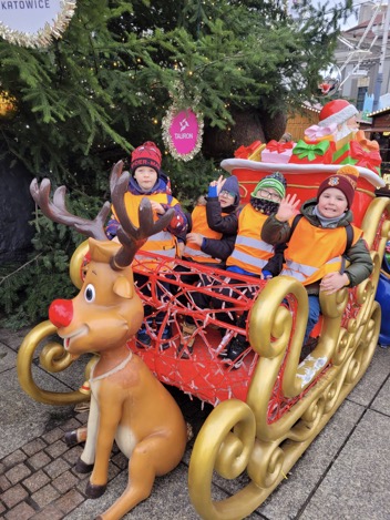 Dzieci z grupy „Delfinki” i „Żabki” wybrały się na jarmark bożonarodzeniowy w Katowicach, aby poczuć magię zbliżających się Świąt. Na miejscu czekała na nich wyjątkowa atmosfera – wszędzie migotały kolorowe światełka, pachniało piernikami i gorącą czekoladą, a z głośników płynęły świąteczne melodie. Przedszkolaki z zachwytem oglądały pięknie udekorowane stragany, podziwiały ręcznie wykonane ozdoby oraz świąteczne dekoracje. Spacer po jarmarku był dla nich niezwykłą przygodą, pełną radości i ciekawych wrażeń. Wszyscy wrócili do przedszkola z szerokimi uśmiechami, pełni świątecznego nastroju i cudownej energii.