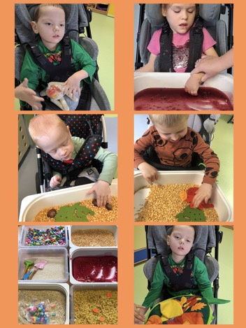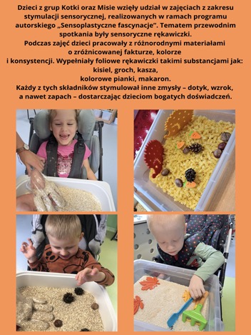 Dzieci z grup Kotki oraz Misie wzięły udział w zajęciach z zakresu stymulacji sensorycznej, realizowanych w ramach programu autorskiego „Sensoplastyczne fascynacje”. Tematem przewodnim spotkania były sensoryczne rękawiczki. Podczas zajęć dzieci pracowały z różnorodnymi materiałami o zróżnicowanej fakturze, kolorze i konsystencji. Wypełniały foliowe rękawiczki takimi substancjami jak: kisiel, groch, kasza, kolorowe pianki, makaron. Każdy z tych składników stymulował inne zmysły – dotyk, wzrok, a nawet zapach – dostarczając dzieciom bogatych doświadczeń.