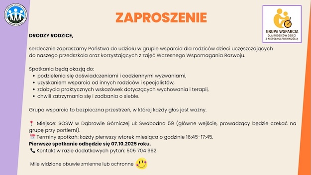 Zaproszenie23 października 2025 Serdecznie witamy rodziców i dzieci uczęszczających na Wczesne wspomaganie rozwoju w naszym Ośrodku. Zapraszamy do oferty poniżej.